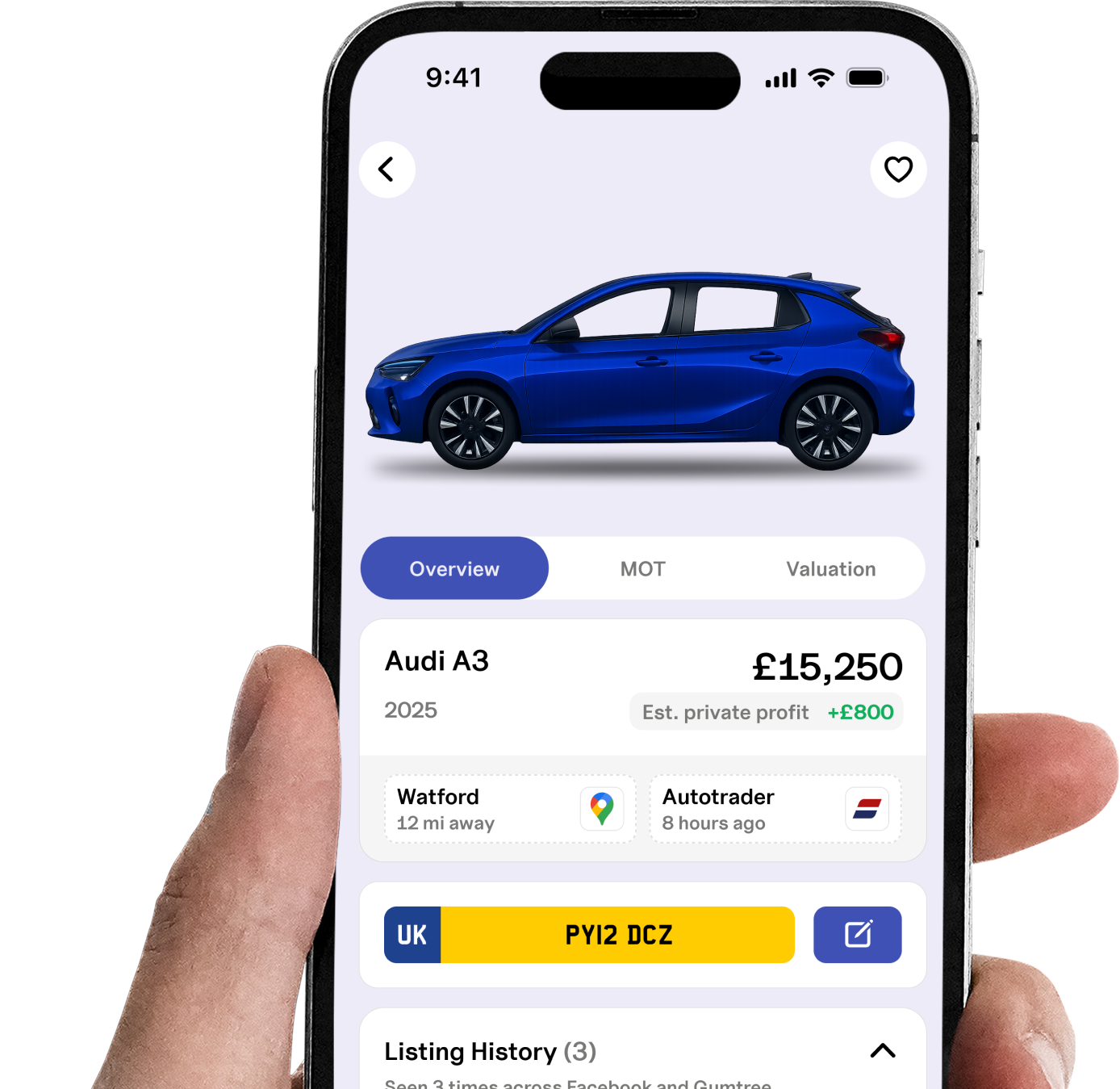 Carhuntr runs your alert searches in the background and scans the market for new listings that match your exact filters (make, model, year, price, mileage, distance, etc.). The moment a matching car is posted, you get an instant alert so you can message/call first instead of manually refreshing apps all day. You can also use tools inside Carhuntr like valuations, history checks, previous listings, and more to help you decide quickly.